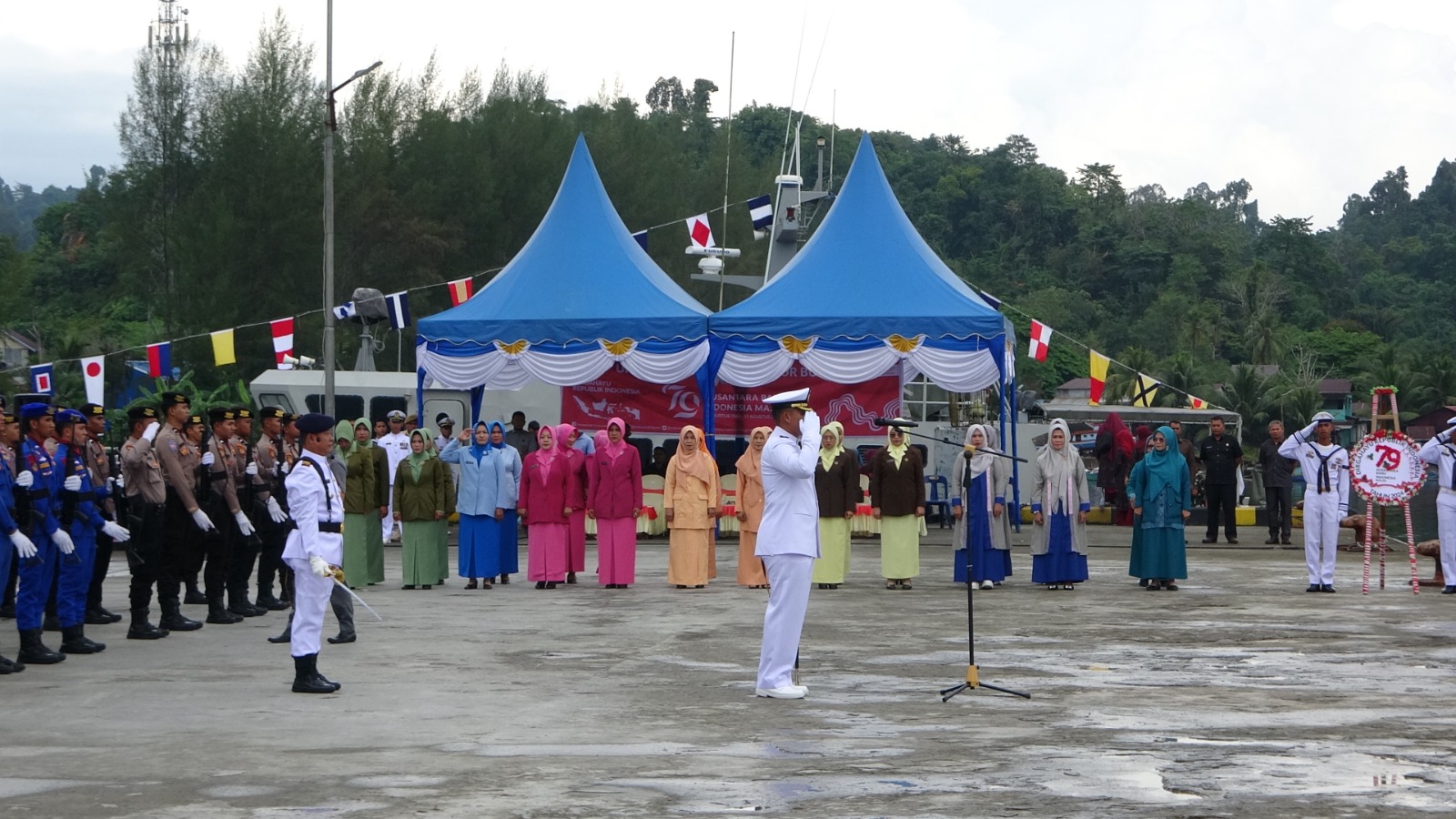TNI AL, Simeulue,- Komandan Pangkalan TNI AL Simeulue Letkol Laut (P) Oyu Mulia Sukmana, S.T., M.T., M.Tr. Opsla., didampingi Ketua Cabang 8 Korcab l DJA I Ny. Meylina Oyu Mulia, melaksanakan kegiatan Tabur Bunga dalam rangka HUT RI Ke-79 Tahun, bertempat di Dermaga Kargo Sinabang, Desa Suka Jaya, Kecamatan Simeulue Timur, Kabupaten Simeulue, Jum’at (16/08/2024).