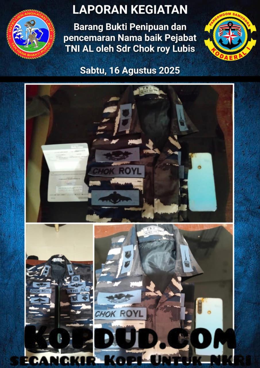 TNI AL, Belawan,- Denintel Kodaeral I berkolaborasi dengan Polres Labuhan Batu berhasil membongkar kasus penipuan dan pemalsuan dokumen yang dilakukan Chok Roy Lubis (42 tahun), warga Labuhan Batu. Pelaku diketahui mengaru sebagai Pejabat TNI Angkatan Laut dengan mengenakan seragam dan menggunakan surat berkop TNI AL untuk meminta dukungan dana dari berbagai perusahaan.