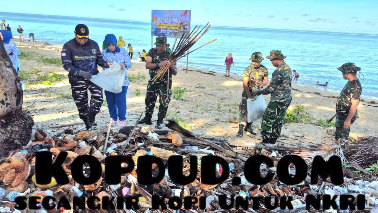 TNI AL, Ambon,- Dalam rangka memperingati Hari Ulang Tahun (HUT) TNI Ke-80, jajaran TNI baik TNI Angkatan Darat, TNI Angkatan Laut dan TNI ANgkatan Udara yang bertugas di wilayah Kabupaten Kepulauan Aru menggelar aksi pembersihan lingkungan di tempat wisata Batu Kora, Desa Wangel, Kecamatan Pulau-Pulau Aru, Selasa (30/9/2025).