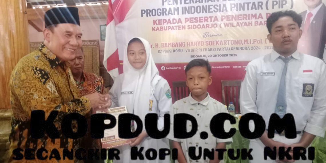 Kopdudu.com, Sidoarjo — Ketua Kelompok Fraksi (Kapoksi) Komisi VII DPR RI dari Fraksi Partai Gerindra, Ir. H. Bambang Haryo Soekartono (BHS), menyerahkan langsung bantuan Program Indonesia Pintar (PIP) kepada 100 pelajar di wilayah Sidoarjo Barat.