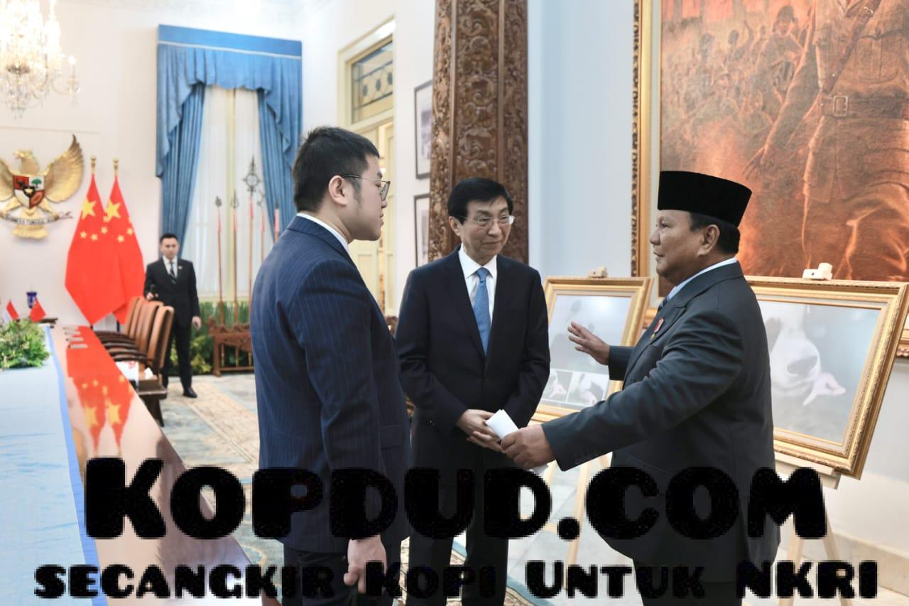 Kopdud.com, Jakarta — Presiden RI Prabowo Subianto memberikan foto bayi panda yang dilahirkan di Indonesia setelah 10 tahun menjadi sorotan ke Ketua MPR China Wang Huning saat pertemuan di Istana Merdeka, Jakarta pada Kamis (4/12).
