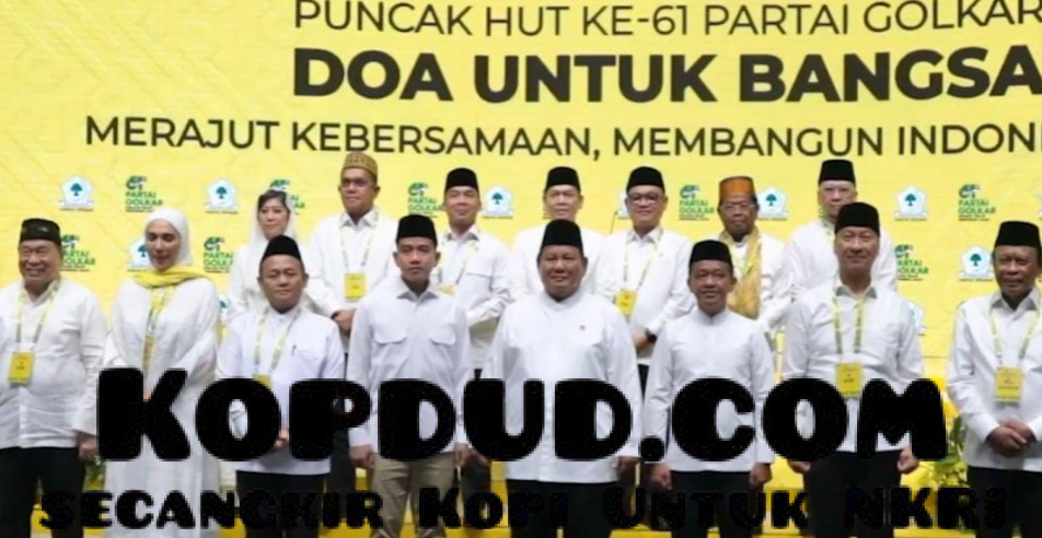 Kopdud.com, Jakarta — Presiden RI Prabowo Subianto menegaskan bahwa bangsa Indonesia adalah negara yang besar dan kuat, serta memiliki kemampuan untuk mengatasi m musibah dan cobaan termasuk bencana alam yang kini melanda Aceh, Sumatera Utara, dan Sumatera Barat. Pernyataan ini disampaikan pada peringatan HUT ke-61 Partai Golkar di Istora Senayan, Jakarta, Jumat (5/12).