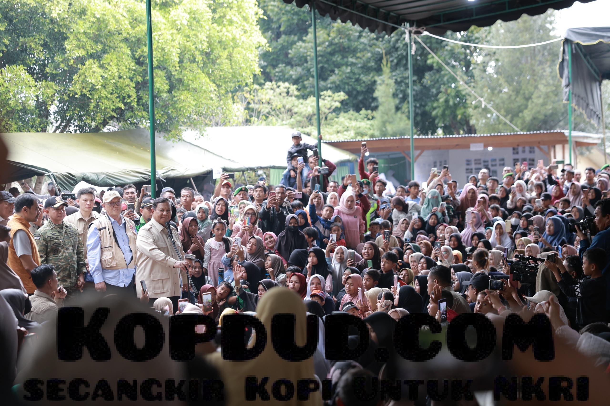“Kita akan atasi ini bersama dan kita sudah siapkan juga rencana untuk mengganti semua rumah,” ujar Prabowo saat meninjau langsung pengungsian di Bener Meriah, Aceh, Jumat (12/12). Pernyataan Prabowo disambut tepuk tangan warga.