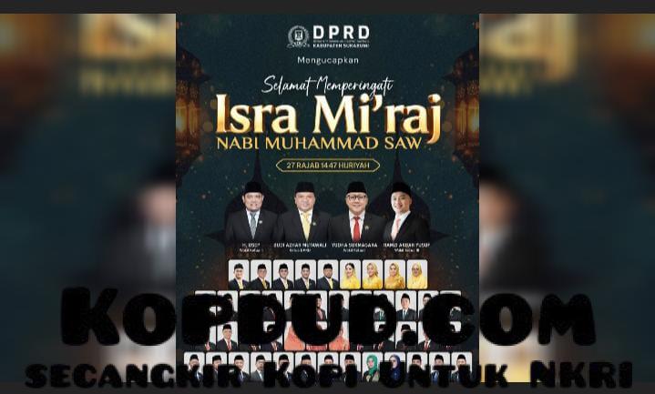 Kopdud.com, Sukabumi – Segenap Pimpinan dan Anggota DPRD Kabupaten Sukabumi menyampaikan ucapan Selamat Memperingati Isra & Mi’raj Nabi Muhammad SAW 1447 H. Momentum bersejarah ini dipandang sebagai pengingat bagi seluruh umat Islam untuk terus memperkuat keimanan, meneguhkan akhlak mulia, serta meningkatkan kualitas ibadah dalam setiap amanah kehidupan.
