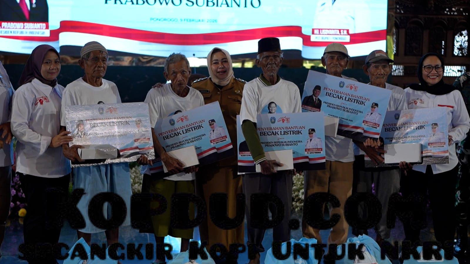 Presiden Prabowo Subianto melalui Yayasan Gerakan Solidaritas Nasional (GSN) menyalurkan 530 becak listrik untuk para pebecak di Ponorogo, Senin (9/2).