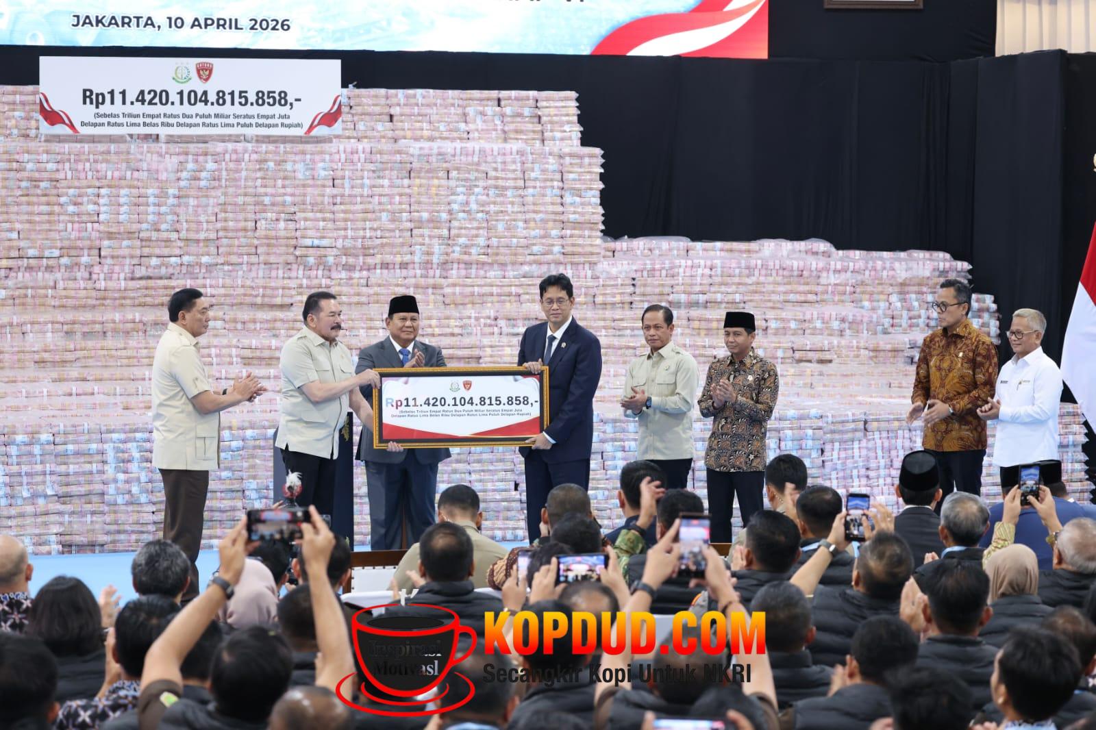 Pada Jumat (10/4) ini, Kejaksaan Agung menyerahkan pengenaan denda administratif dan pemulihan kerugian akibat aktivitas ilegal di dalam kawasan hutan sebesar Rp 11,42 triliun yang disaksikan Prabowo. Ini merupakan hasil penindakan periode Januari-April 2026 yang berasal di antaranya dari denda administratif, PNBP penanganan tindak pidana korupsi, setoran pajak, dan PNBP denda lingkungan hidup.