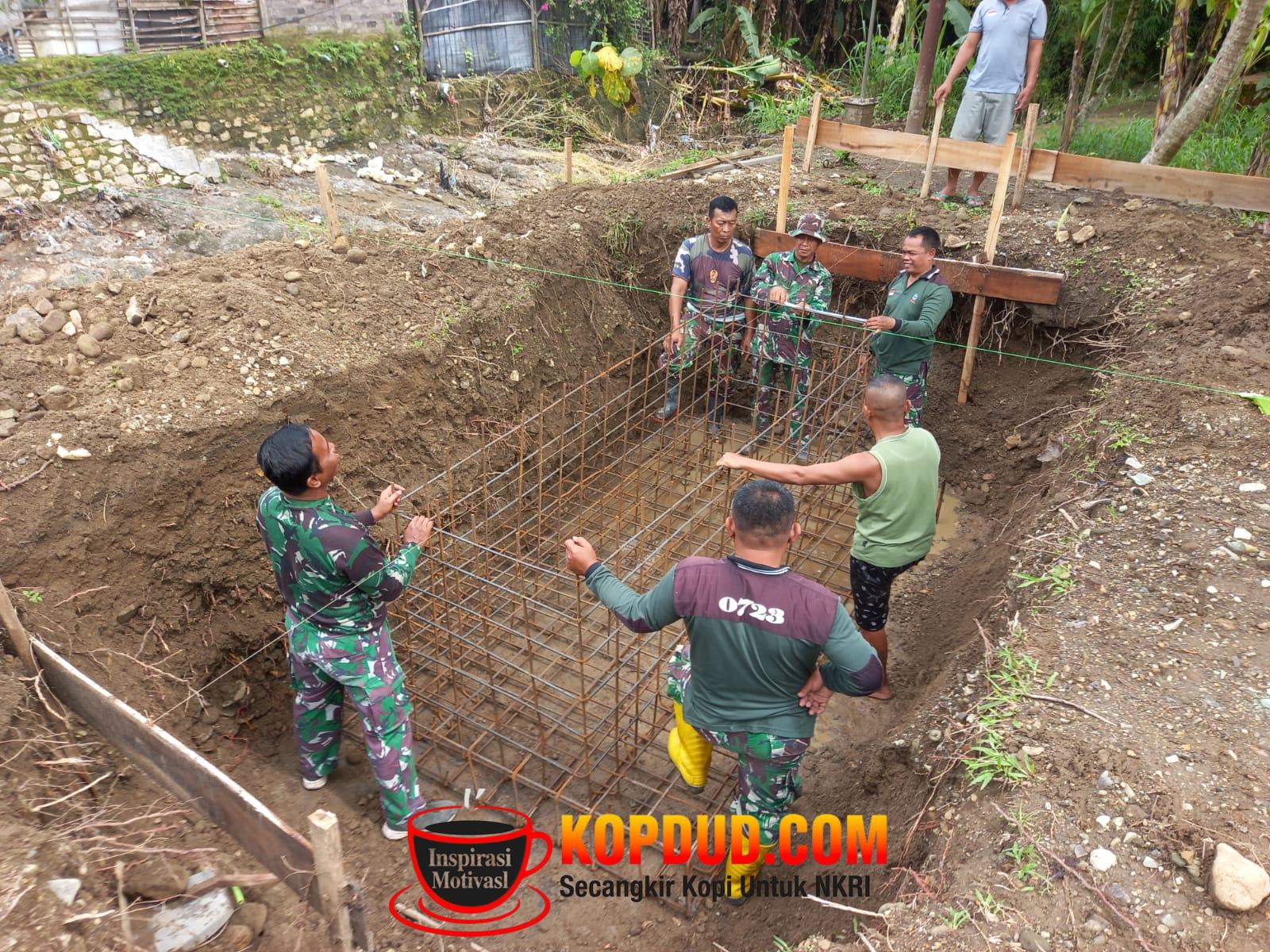 Sejumlah personel terlihat mengeruk tanah di sisi sungai menggunakan ekskavator sebagai titik fondasi utama jembatan. Selanjutnya, mereka pun dibantu warga untuk memasang kerangka besi dan mengecor dengan semen agar struktur lebih kokoh.